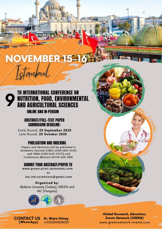 5th International Conference on Nutrition, Food, Environmental and Agricultural Sciences, 21-22 Oct 2023, Istanbul, Turkey.